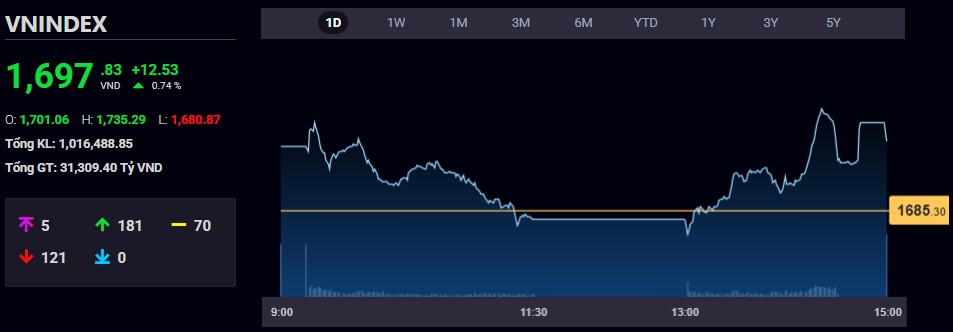 Chốt phiên 8/10, chỉ số VN-Index tăng 12,53 điểm lên 1.697,83 điểm. Thanh khoản thị trường tăng mạnh với tổng giá trị giao dịch trên sàn HOSE đạt hơn 33.200 tỷ đồng, tương đương 1,25 tỷ USD.