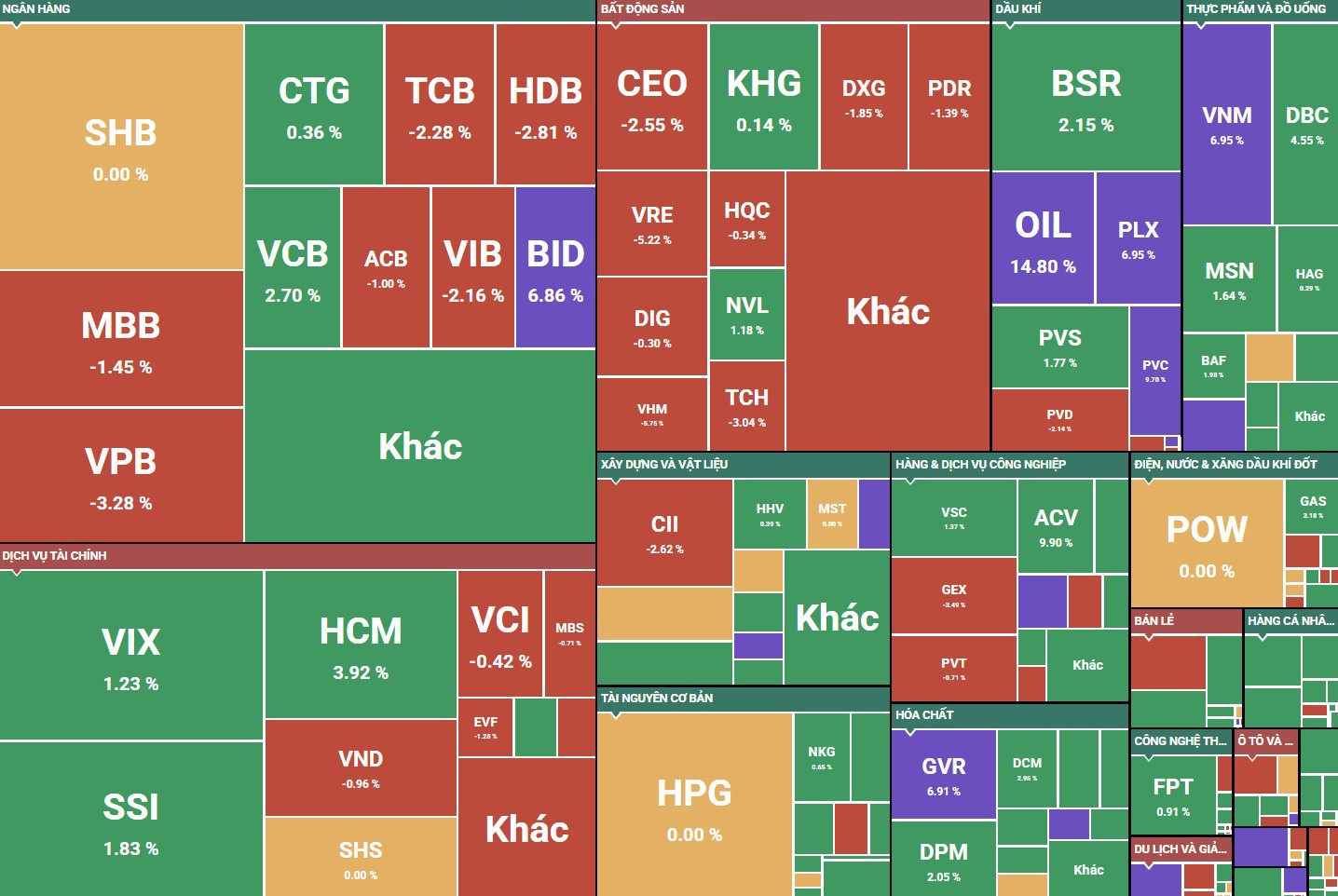 Dầu khí là ngành hiếm hoi duy trì được sự đồng thuận tích cực, với các mã OIL, PVC và PLX tăng hết biên độ. Các mã lớn như GAS, BSR và PVS cũng tăng từ 1,8-3,2%.