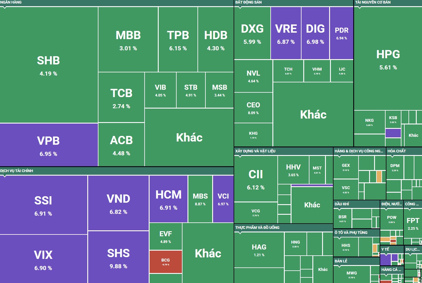 Dẫn đầu đà tăng hôm nay là nhóm cổ phiếu ngân hàng, chứng khoán. Trong đó, loạt mã cổ phiếu ngành chứng đóng cửa trong sắc tím như SSI, VIX, VND, SHS, HCM, VCI, VDS, CTS, DSE… Một số mã khác cũng tăng trên 6% như BVS, FTS, MBS…