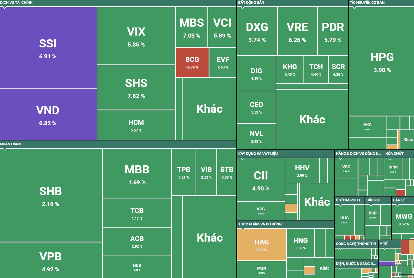 Một số cổ phiếu chứng khoán khác cũng tăng mạnh, thanh khoản khớp lệnh đạt hơn 10 triệu đơn vị, như: VND (+6,82%), VIX (+5,35%), SHS (+7,82%), HCM (+5,57%).
