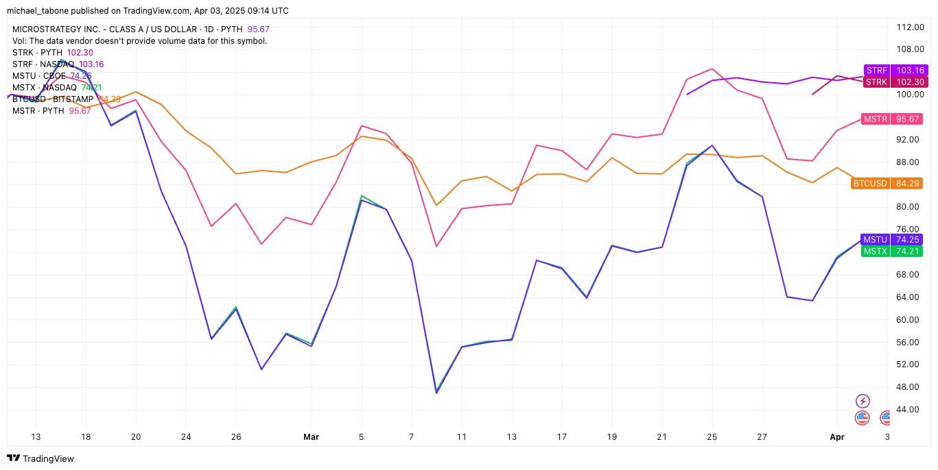 Khi quy về mức 100 từ đầu năm 2025, hiệu suất của các công cụ liên quan tới Strategy cho thấy tác động của đòn bẩy trong hệ sinh thái tài chính gắn với Bitcoin. Đầu tháng 4/2025, MSTR giảm nhẹ khoảng 8%, bám theo đà lao dốc của Bitcoin (giảm 16%).