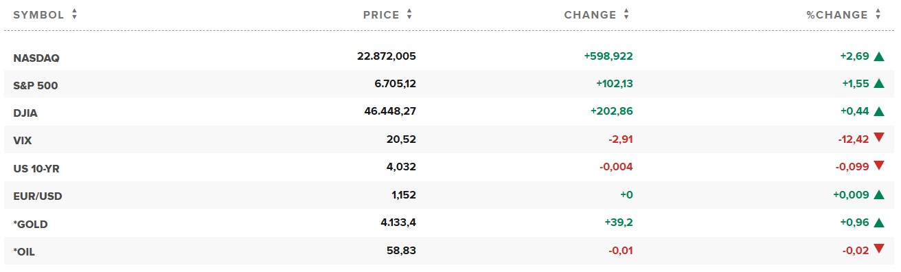 Kết phiên, chỉ số S&P 500 tăng 1,55% lên 6.705,12 điểm. Chỉ số Dow Jones cũng tăng 202,86 điểm, tương đương 0,44%, lên 46.448,27 điểm.