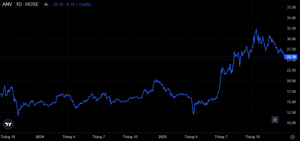 Đáng chú ý, trong một số thời điểm của năm, ANV ghi nhận mức tăng lên tới gần 170% so với vùng đáy thiết lập vào tháng 4, cho thấy biên độ hồi phục rất mạnh của cổ phiếu sau giai đoạn suy giảm sâu.