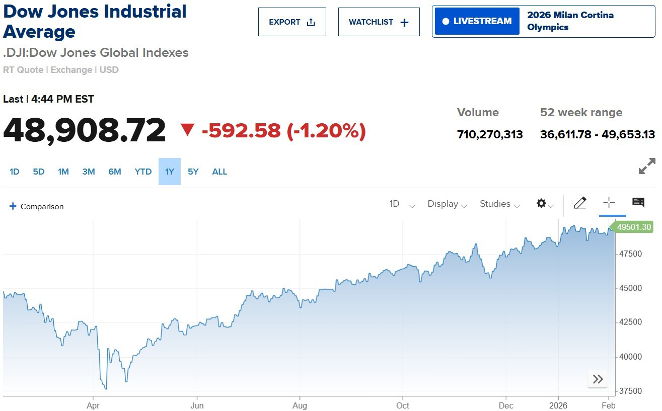 Chứng khoán Mỹ tiếp tục giảm mạnh trong phiên 5/2 khi tâm lý né rủi ro gia tăng, kéo theo làn sóng bán tháo ở nhóm cổ phiếu công nghệ và tài sản rủi ro. Các chỉ số chính đồng loạt đi xuống, trong bối cảnh nhà đầu tư tái định giá triển vọng tăng trưởng và chi tiêu vốn của các doanh nghiệp công nghệ lớn.