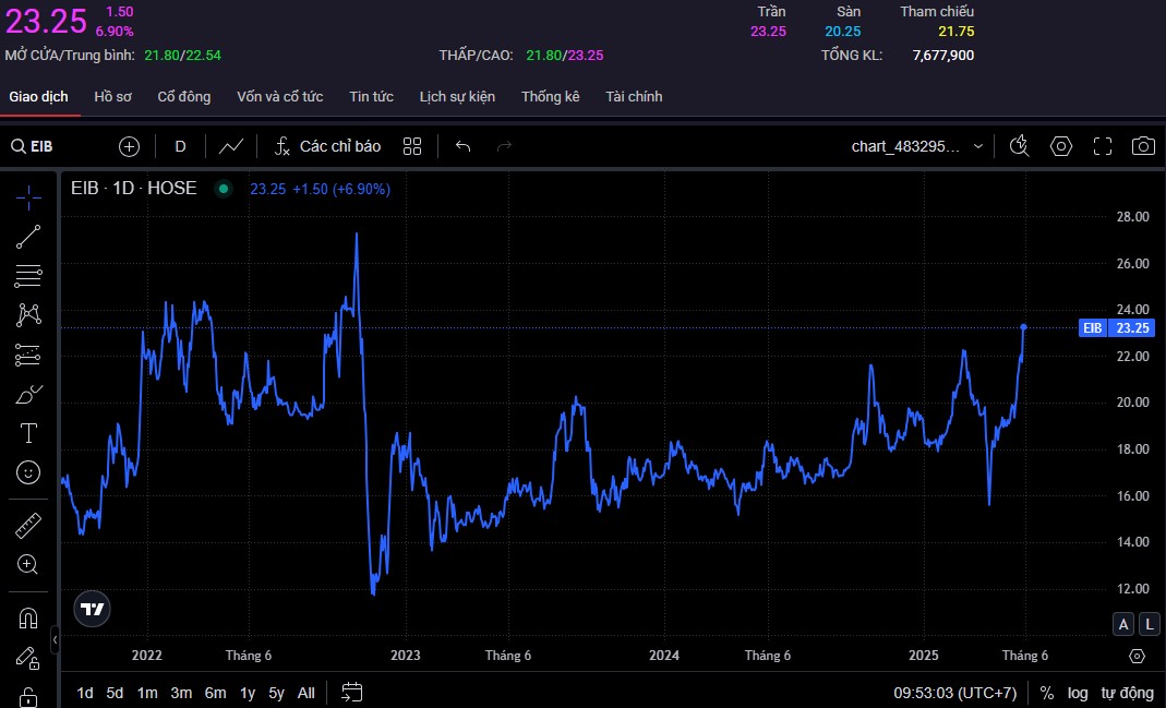 Trong 10 phiên giao dịch, cổ phiếu EIB đã tăng tới 19,5% thị giá. Còn so với mức đáy gần nhất vào phiên 9/4 sau đợt bán tháo của thị trường chứng khoán Việt Nam - ảnh hưởng từ đòn thuế quan Mỹ, cổ phiếu EIB đã bật tăng tới 49%.