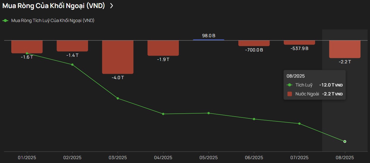 Trong phiên giao dịch hôm nay (13/8), khối ngoại bán ròng hơn 10 triệu cổ phiếu FPT, tương đương hơn 1.000 tỷ đồng. Đây là phiên bán ròng thứ 16 liên tiếp, nâng tổng giá trị bán ròng từ đầu năm 2025 đến nay lên 12.000 tỷ đồng.