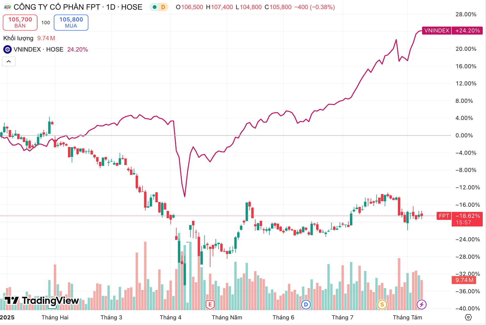 Biểu đồ so sánh giá của cổ phiếu FPT và Vn-Index, Chốt phiên 8/8/2025, thị giá FPT đang ở mức cổ phiếu 105.600 đồng/cp, giảm 1% so với giá tham chiếu, nhưng nếu so với mức 131.000 đồng hồi đầu 2025, mã này đã mất gần 20% giá trị. - Ảnh: Nguồn Trading View