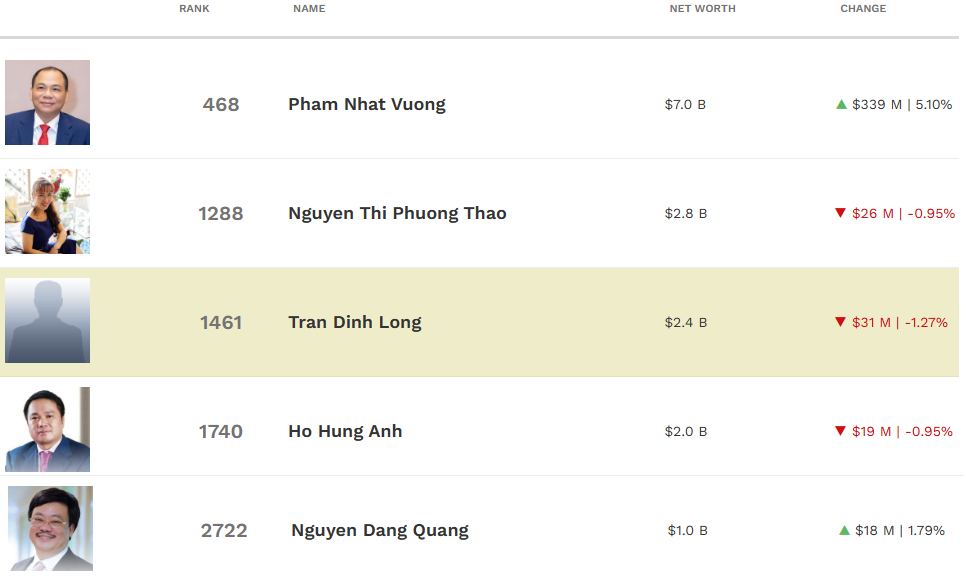 Còn theo dữ liệu của Forbes, cập nhật đến 15h ngày 13/3, ông Phạm Nhật Vượng là người giàu nhất Việt Nam với khối tài sản 7 tỷ USD, tăng 339 triệu USD chỉ trong 1 ngày. Tính trong 3 ngày gần nhất, khối tài sản của ông Vượng đã tăng 570 triệu USD, vị trí xếp hạng tăng 28 bậc, đứng thứ 468 thế giới.