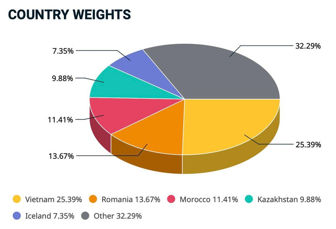 Tại ngày 31/7, Việt Nam vẫn là quốc gia chiếm tỷ trọng cao nhất trong rổ chỉ số của MSCI Frontier Market Index, với tỷ lệ 25,39%. Xếp thứ 2 là Romania với 13,67%. Trong top 10 cổ phiếu chiếm tỷ trọng cao nhất, Việt Nam cũng đóng góp 2 đại diện là HPG (xếp thứ 4) và VHM (xếp thứ 9).