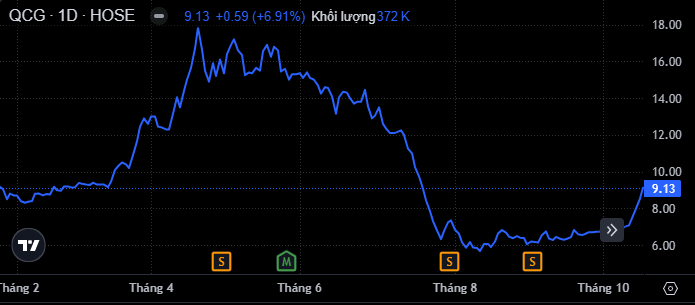 Cụ thể, kết phiên 16/10, cổ phiếu QCG đóng cửa ở mức 9.130 đồng/cp, tăng 6,91% so với tham chiếu.