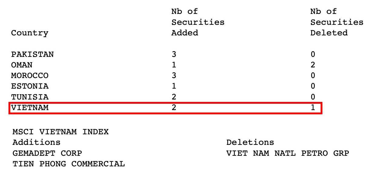 Trong đợt review quý 1/2025, MSCI đã thêm 2 mã cổ phiếu TPB (Ngân hàng TMCP Tiên Phong) và GMD (CTCP Gemadept) vào rổ tính MSCI Frontier Markets Index, đồng thời loại cổ phiếu PLX (Tập đoàn Xăng dầu Việt Nam) ra khỏi bộ chỉ số.