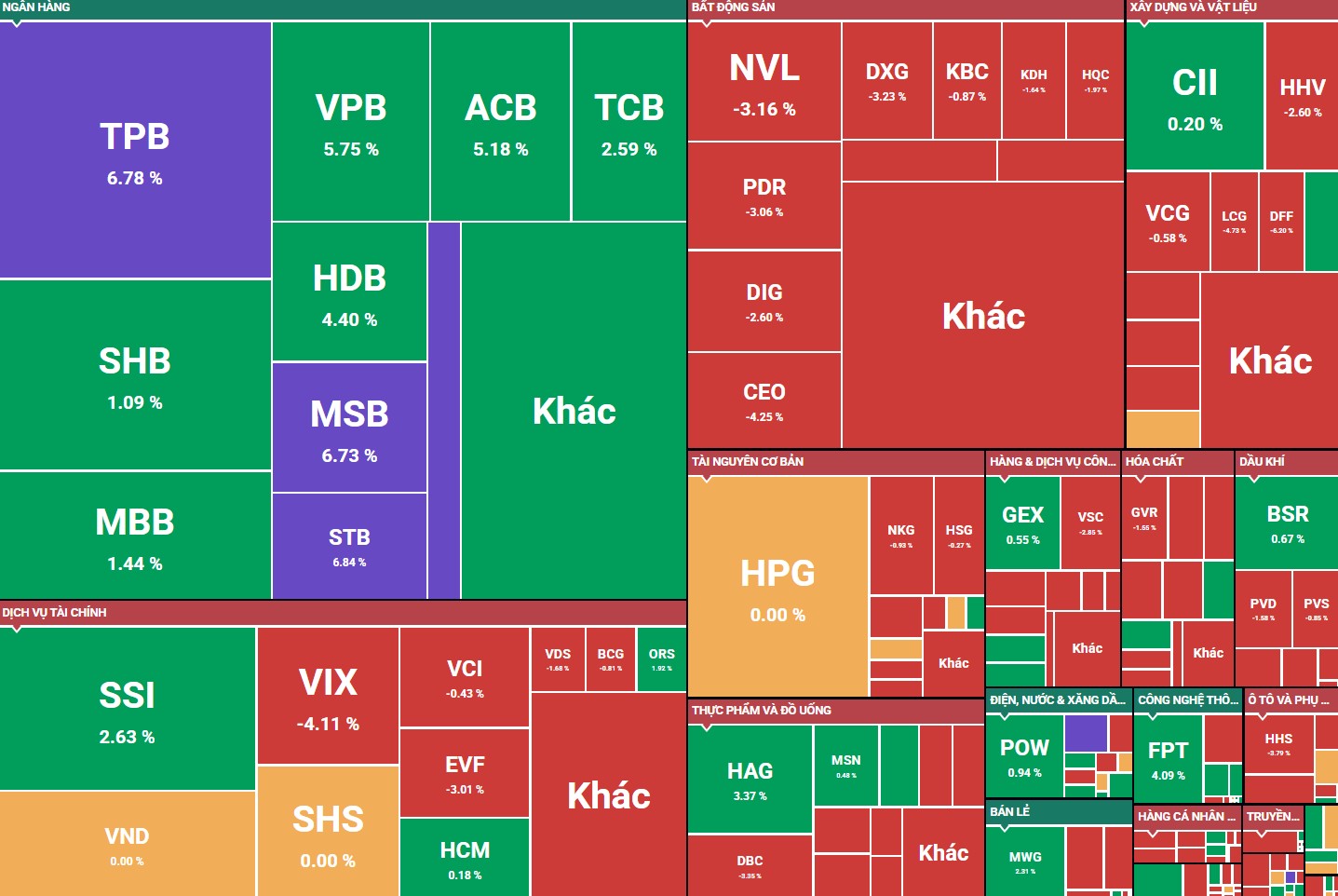 Đáng chú ý, toàn bộ 27 "cổ phiếu vua" đều đóng cửa trong sắc xanh tăng điểm. Trong đó, 6 mã tăng kịch biên độ gồm OCB, SSB, VIB, STB, TPB và MSB. Dư mua giá trần cũng ở mức cao, lên tới cả chục triệu đơn vị mỗi mã.