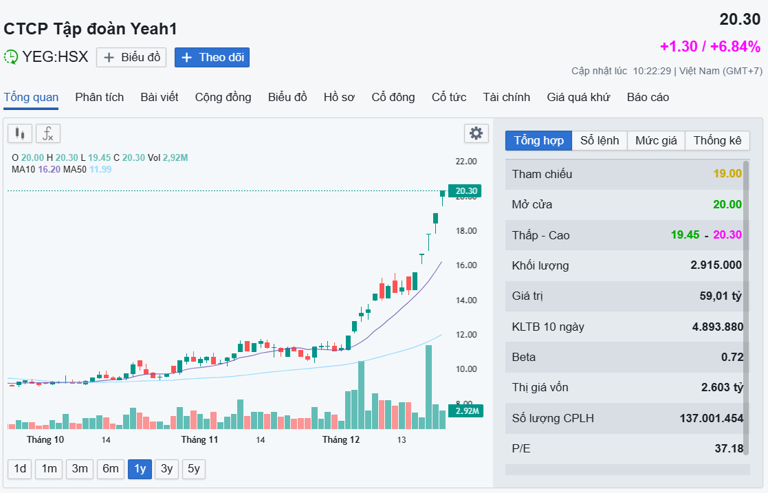 Trong phiên giao dịch sáng nay (23/12), cổ phiếu YEG của CTCP Tập đoàn Yeah1 tiếp tục tăng kịch biên độ lên mức 20.300 đồng/cp. Tính đến 10h30, thanh khoản mã này neo ở mức cao với gần 3 triệu cổ phiếu được trao tay qua phương thức khớp lệnh.