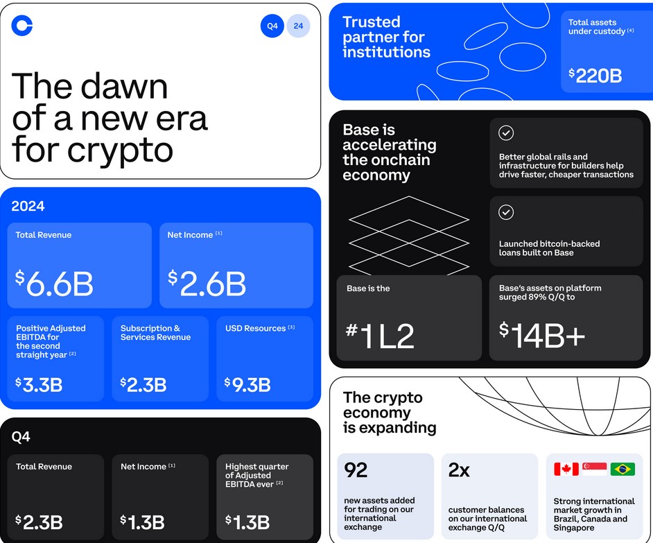 Báo cáo tài chính của Coinbase cho thấy doanh thu Q4/2024 đạt 2,3 tỷ USD, tăng 88% so với cùng kỳ. Lợi nhuận ròng cũng vượt kỳ vọng khi đạt 1,3 tỷ USD.