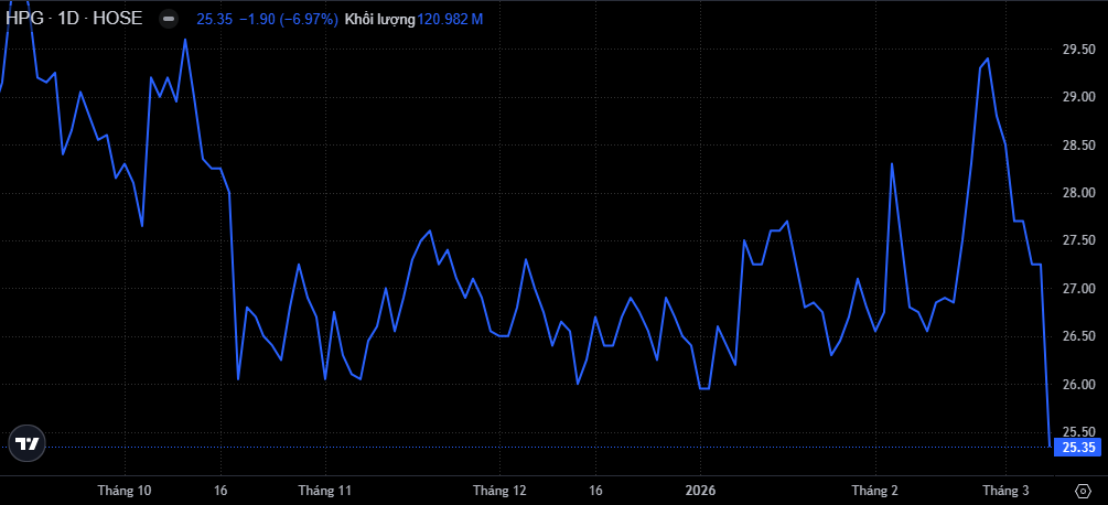 Động thái của con trai Chủ tịch Trần Đình Long diễn ra trong bối cảnh cổ phiếu HPG - theo diễn biến chung của VN-Index - đã giảm kịch sàn trong phiên giao dịch hôm nay (9/3). Theo đó, thị giá mã này giảm 6,97% xuống còn 25.350 đồng/cp - mức thấp nhất kể từ tháng 8 năm ngoái.