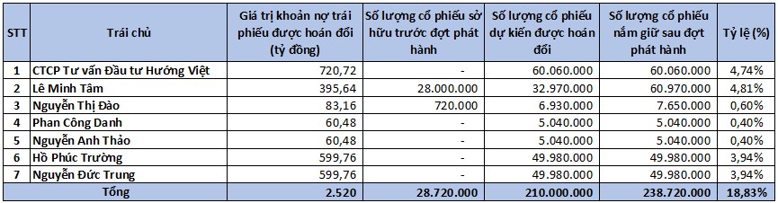Tổng giá trị các khoản nợ được hoán đổi là 2.520 tỷ đồng, với tỷ lệ hoán đổi ở mức 12.000:1 – tức 12.000 đồng nợ trái phiếu sẽ được quyền hoán đổi thành 1 cổ phiếu mới. Số cổ phiếu này sẽ bị hạn chế chuyển nhượng trong vòng 1 năm. Thời gian thực hiện dự kiến trong năm 2025.