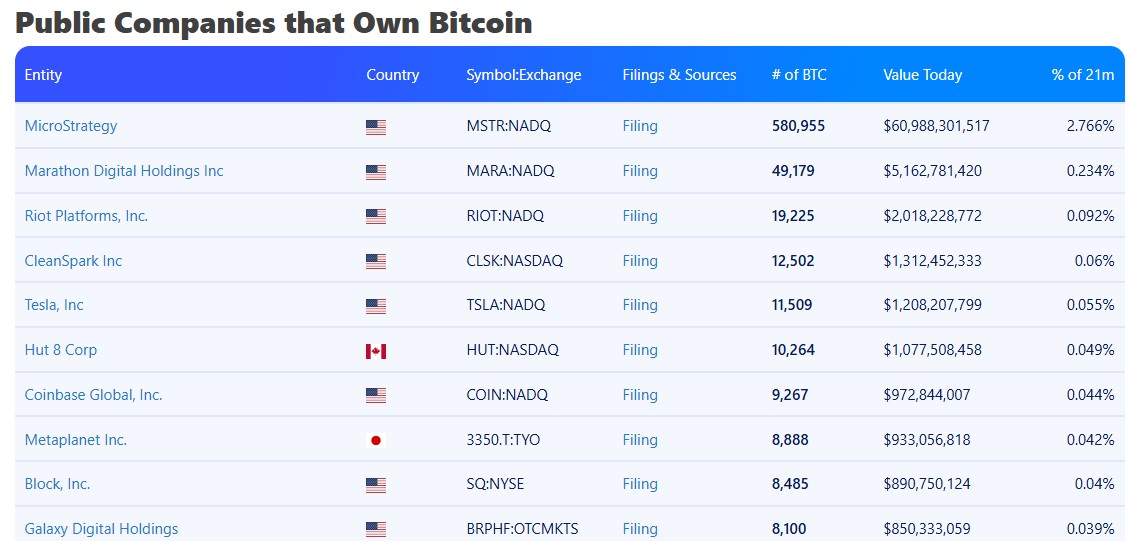 Trong khi đó, các công ty không liên quan trực tiếp đến blockchain vẫn chưa thực sự tham gia. Tính đến hiện tại, chỉ có Tesla và Strategy nổi bật trong nhóm này.