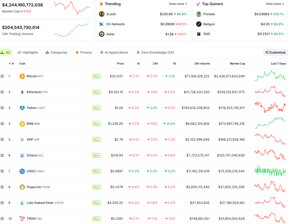Thị trường chững nhịp sau những ngày tăng nóng. Vốn hóa toàn ngành lùi về mốc 4,2 nghìn tỷ USD, với khối lượng giao dịch 24h đạt 204 tỷ USD. Bitcoin lùi về 120.000 USD, Ethereum suy yếu theo, còn altcoin đồng loạt lao dốc.