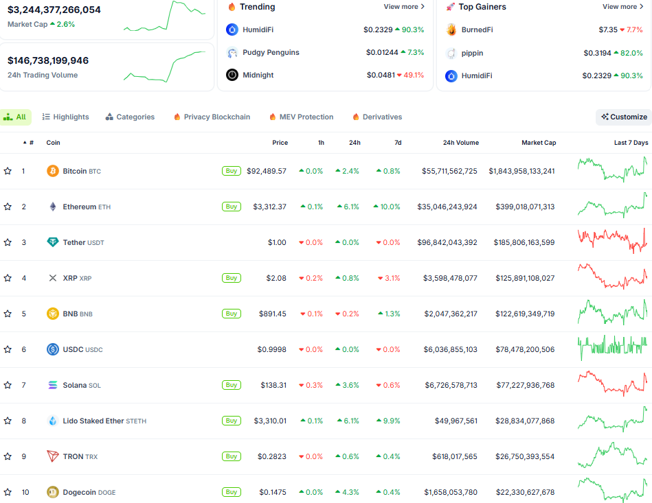 Thị trường crypto bật xanh khi BTC giữ chắc vùng 91.000–92.000 USD, báo hiệu lực bán ngắn hạn đã hạ nhiệt. ETH tăng mạnh lên 3.300 USD, kéo nhóm altcoin hồi phục trên diện rộng.