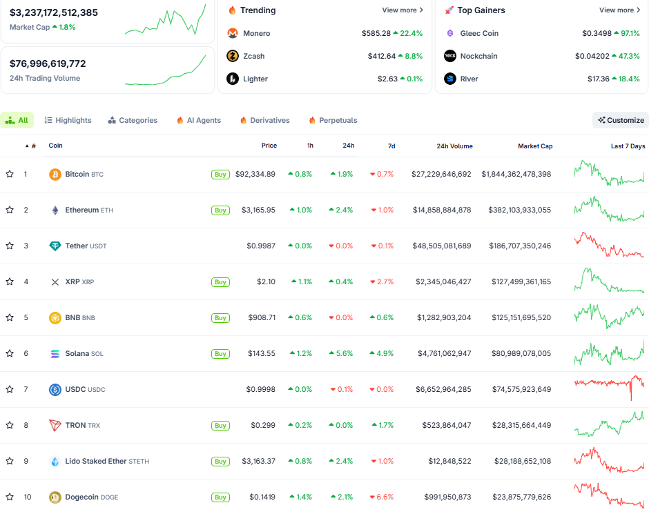 Bitcoin tiếp tục giao dịch quanh ngưỡng 92.000 USD, tỷ lệ thống trị thị trường BTC.D đạt 58,6%. Vốn hóa thị trường nhích nhẹ 1,8% lên mốc 3,2 nghìn tỷ USD. Khối lượng giao dịch 24h đạt 76 tỷ USD.