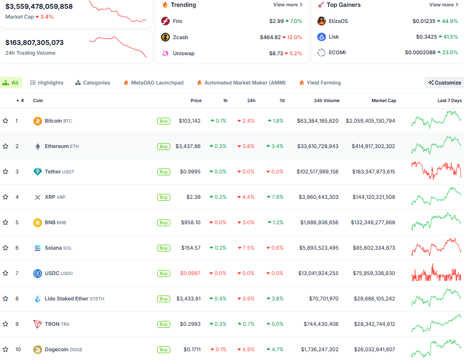 "Đầu tàu" BTC trượt về mốc 103.000 USD, kéo vốn hóa thị trường giảm 3,4% về ngưỡng 3,5 nghìn tỷ USD. Chỉ trong 24h qua, gần 500 triệu USD vị thế bị thanh lý, trong đó phần lớn đến từ "phe Long".