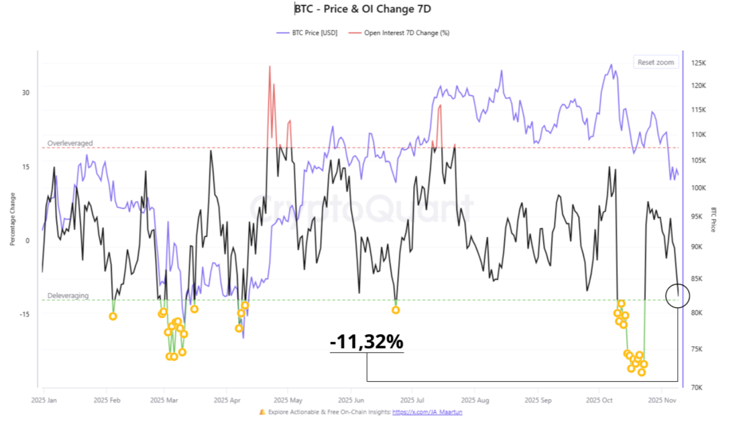 Theo CryptoQuant, open interest (OI) - tổng lượng vị thế mở trên thị trường hợp đồng tương lai - đã giảm hơn 11% chỉ trong vòng một tuần. Đây là tín hiệu cho thấy nhà đầu tư đang rút khỏi các vị thế rủi ro ngắn hạn.