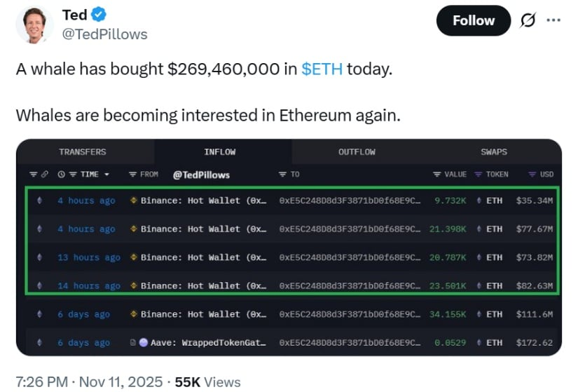 Một “cá voi” đã mua tới 75.418 ETH trong 24h qua (Nguồn: @TedPillows)
