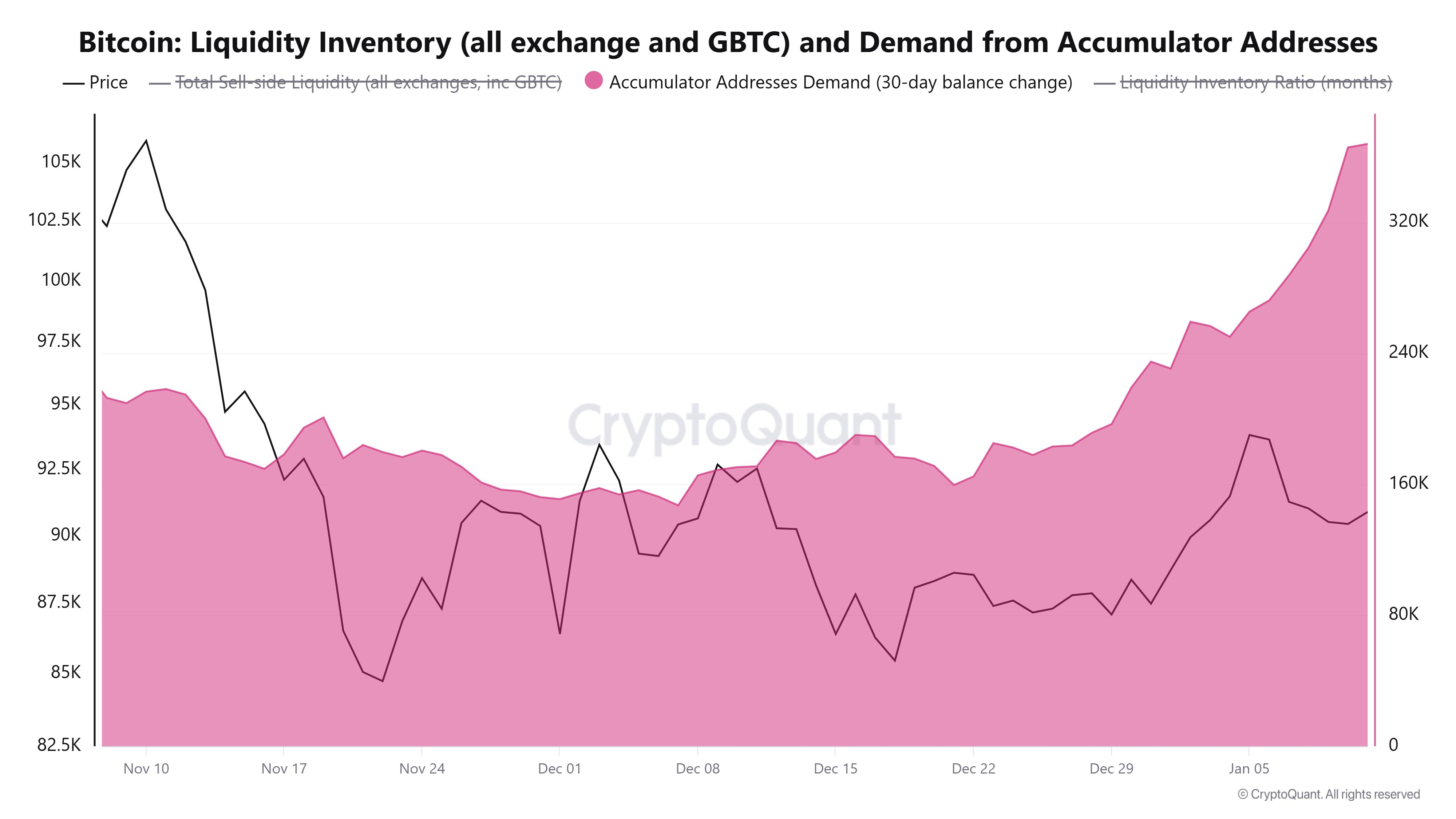 Song song, các địa chỉ tích lũy (liên tục mua, không phân phối) tiếp tục gom hàng trong năm 2026, mua ròng gần 136.000 BTC chỉ trong 11 ngày đầu tháng – một lực đỡ đáng kể cho xu hướng giá.