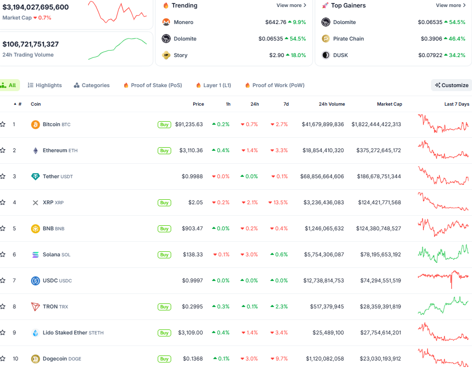 Thị trường crypto ngày 13/1 (Nguồn: CoinGecko)