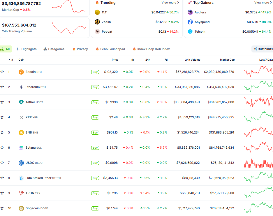 Thị trường crypto ngày 13/11 (Nguồn: CoinGecko)