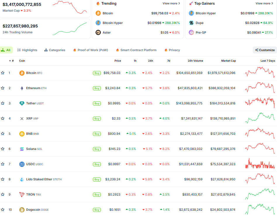 BTC lần đầu tiên đóng nến ngày dưới 100.000 USD trong 6 tháng qua, ETH mất mốc 3.200 USD và loạt altcoin đồng loạt cắm đầu. Vốn hóa thị trường giảm 3,3%, chỉ còn 3,4 nghìn tỷ USD.