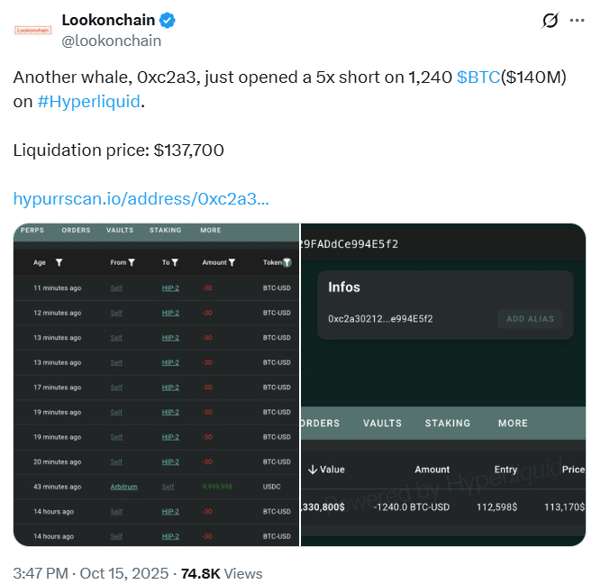 Theo dữ liệu từ Lookonchain, một cá voi trên sàn phi tập trung Hyperliquid vừa mở vị thế short trị giá 140 triệu USD (1.240 BTC) với đòn bẩy 5x, mức thanh lý ở quanh 137.700 USD.