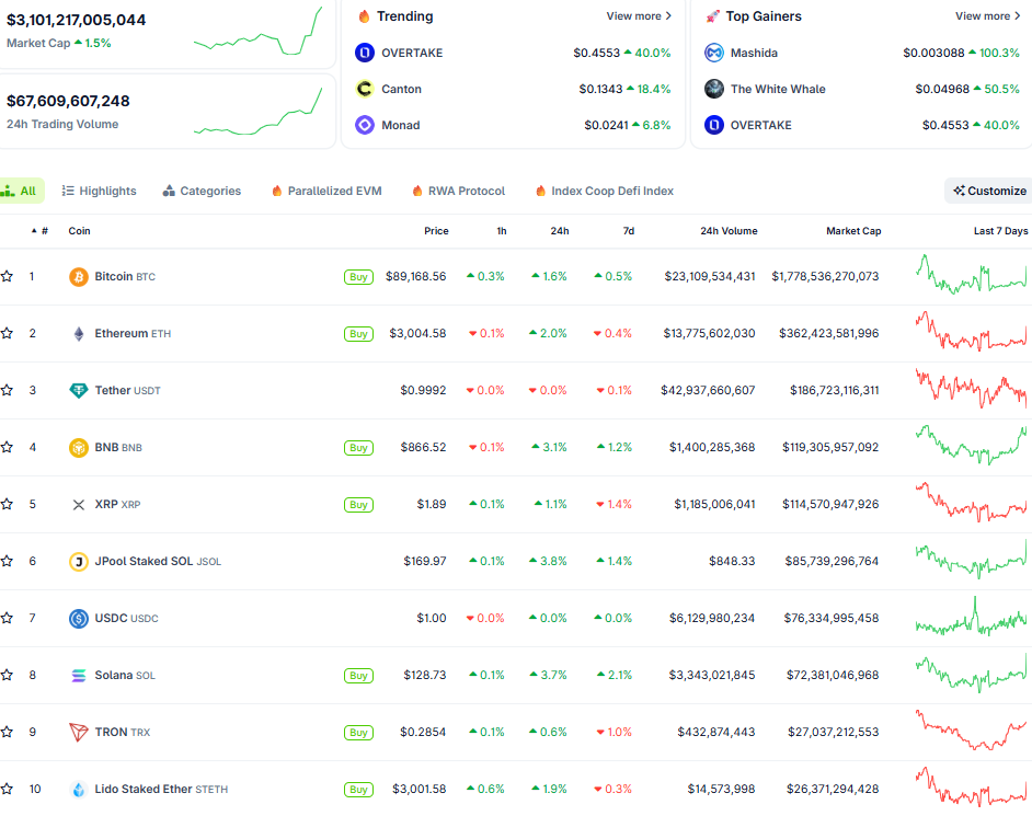 Vốn hóa thị trường đầu tuần khởi sắc khi tăng 1,2% lên mốc 3,1 nghìn tỷ USD. Dẫu phần đa các altcoin đều ghi nhận sắc xanh nhẹ, nhưng khối lượng giao dịch 24h chỉ đạt 67 tỷ USD.