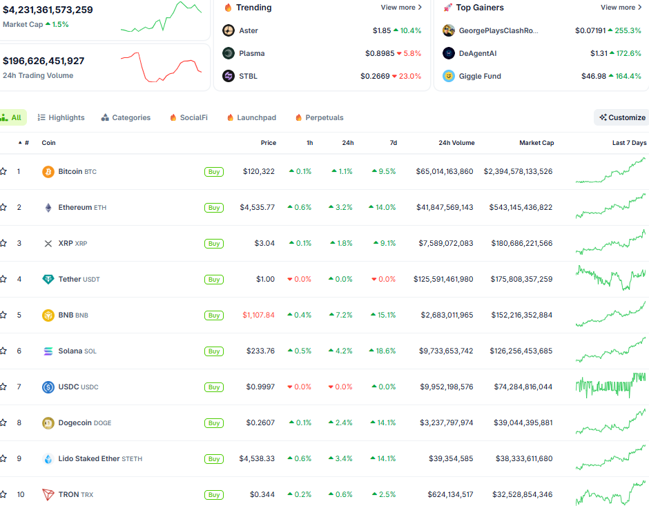 Thị trường chứng khoán Mỹ tiếp tục lập đỉnh, trong khi Bitcoin áp sát vùng giá 124.000 được thiết lập hồi tháng 8, ETH lấy lại mốc 4.500 USD, còn BNB lập đỉnh mới 1.100 USD.