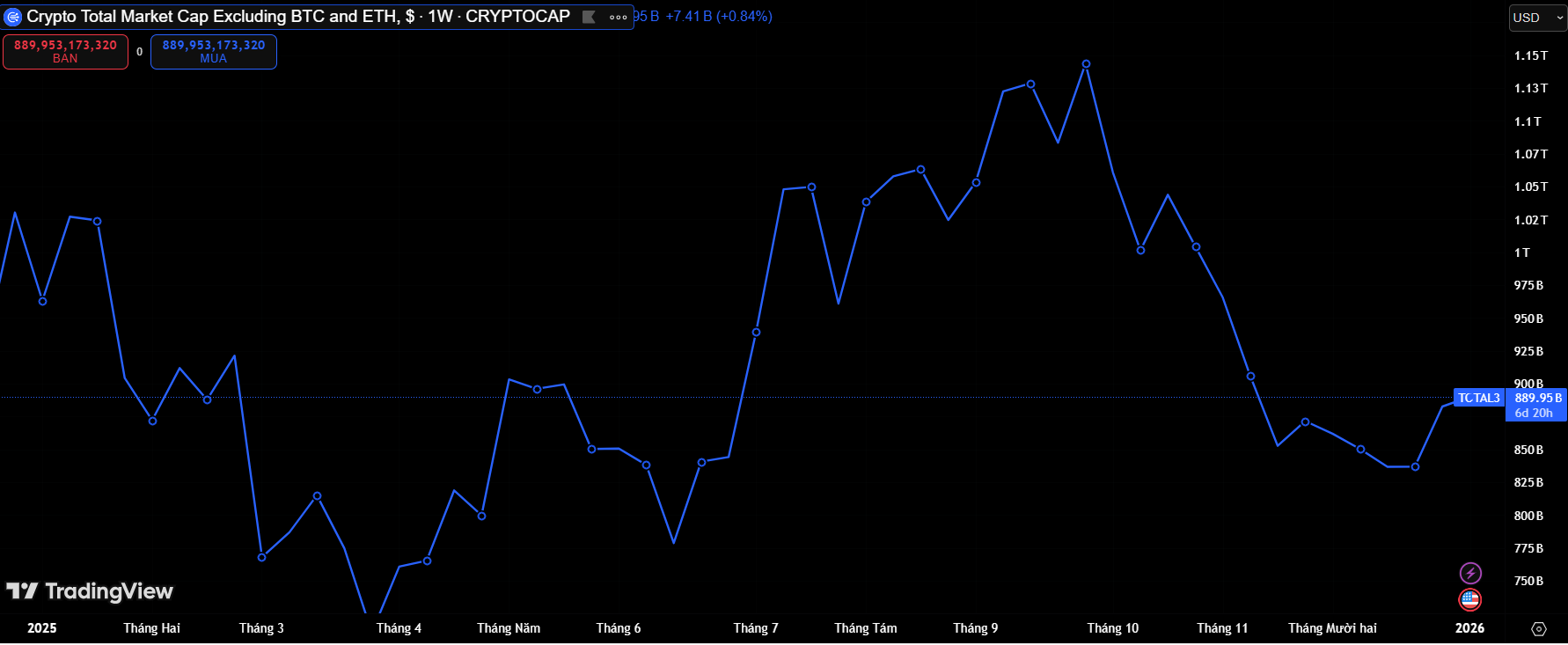 Theo dữ liệu từ TradingView, Total3 đang dần quay trở lại đường trung bình động 365 ngày. Trước đó, vào tháng 10, Total3 từng chạm đỉnh lịch sử gần 1.200 tỷ USD, nhưng nhanh chóng lao dốc sau cú sập thị trường mang tính lịch sử, khiến vốn hóa altcoin “bốc hơi” khoảng 33% chỉ trong một ngày.