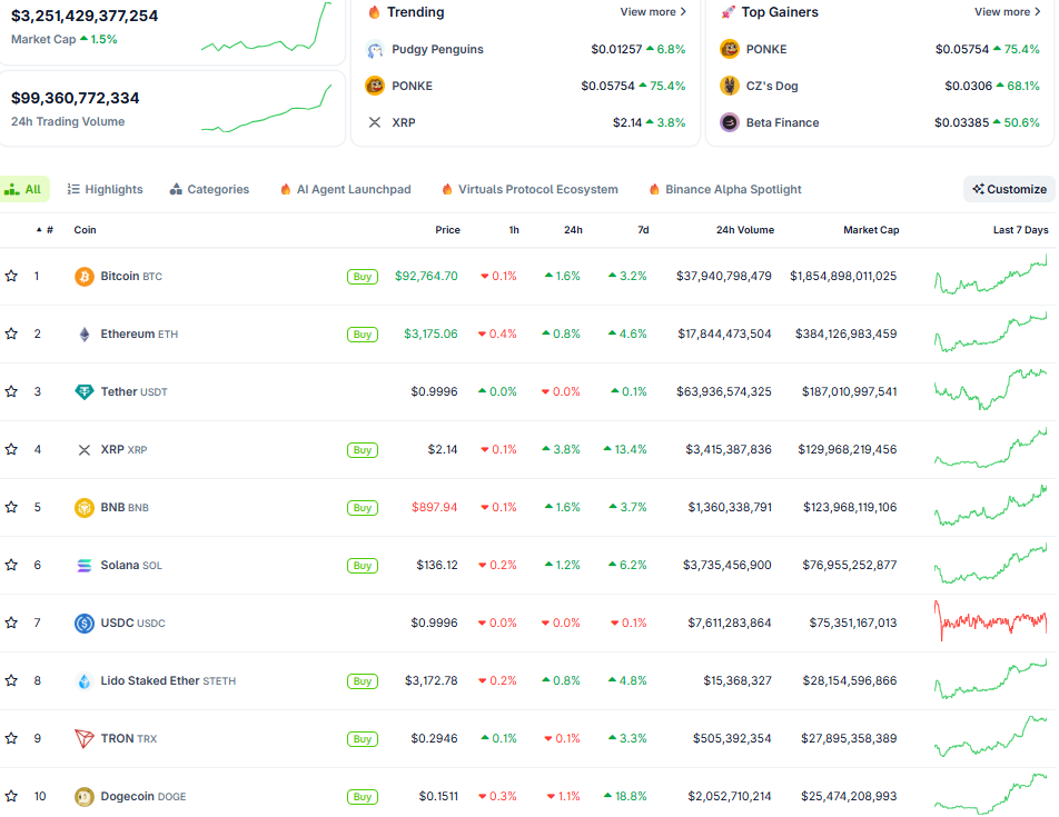 Bitcoin vượt 93.000 USD, Ether áp sát 3.200 USD, kéo vốn hóa toàn thị trường tăng thêm khoảng 200 tỷ USD. Mảng memecoin nhảy vọt với nhiều cái tên tăng trưởng 2 chữ số.