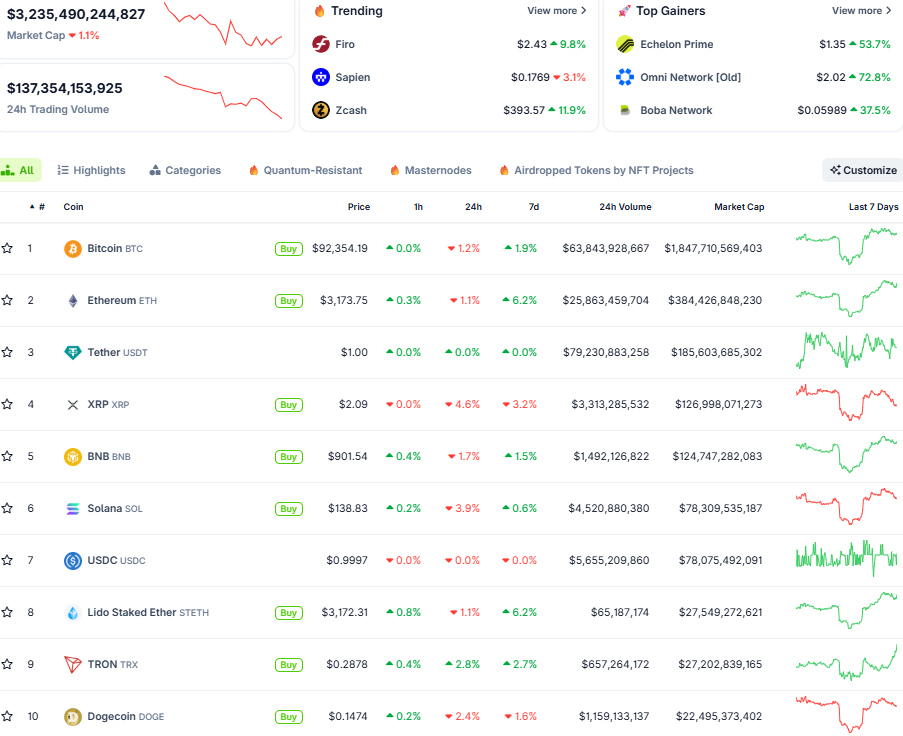 Vốn hóa thị trường đạt 3,2 nghỉn tỷ USD, khối lượng giao dịch trong 24h chỉ quanh ngưỡng 137 tỷ USD. Các đồng top coin như ETH, SOL, BNB chưa tạo được đột phá.