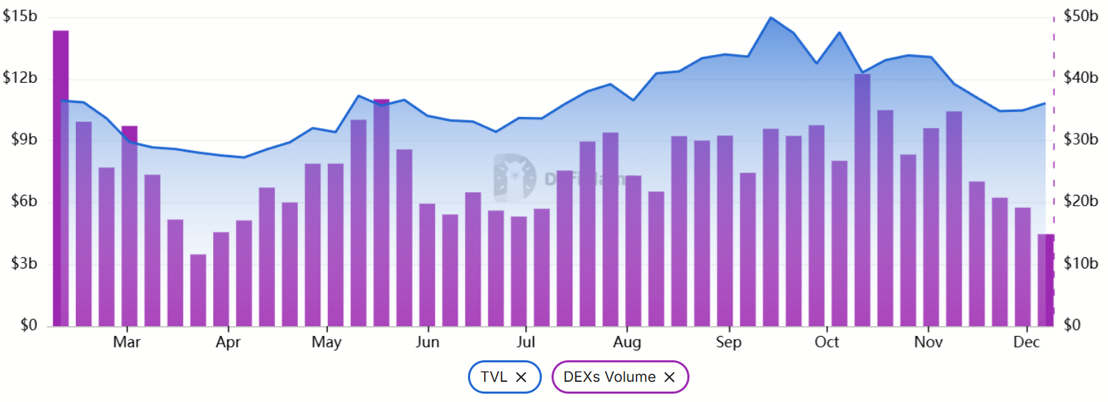 Tổng giá trị khóa trên Solana (trái) so với khối lượng DEX 7 ngày (Nguồn: DefiLlama)