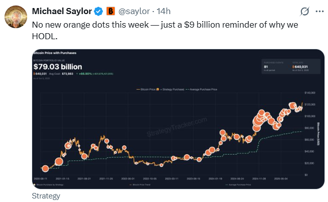 Trong khi đó, "thánh coin" Saylor bất ngờ tuyên bố sẽ không gom thêm Bitcoin trong tuần này, đánh dấu lần đầu tiên Strategy tạm dừng sau chuỗi mua kéo dài suốt quý 3. Hiện công ty đang nắm giữ tổng cộng 640.031 BTC, tương đương khoảng 79,1 tỉ USD theo giá thị trường.