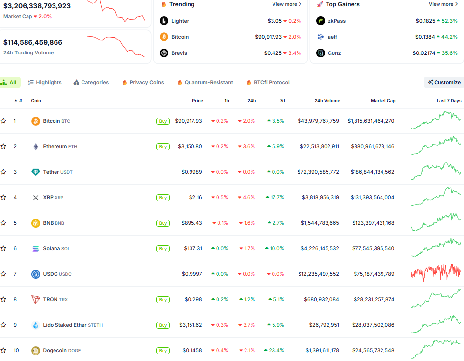 Bitcoin giảm 2,3% rơi về vùng 90.000 USD, bất chấp loạt tín hiệu tín cực từ thị trường. Vốn hóa thị trường theo đó cũng sụt giảm về 3,1 nghìn tỷ USD. Tâm lý thị trường rơi từ mốc 43 điểm (trung lập) về 25 điểm (sợ hãi).