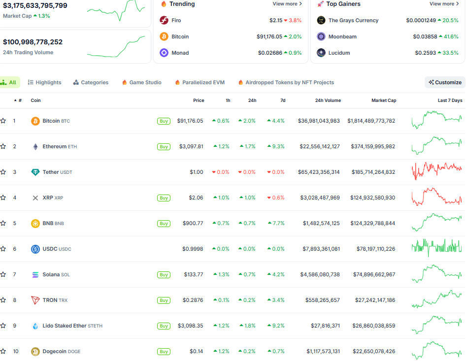 BTC bất ngờ vọt lên 91.000 USD, sau cú quét về 87.000 USD vào cuối tuần qua. Đà tăng kích hoạt đợt thanh lý trên thị trường. Vốn hóa toàn ngành đạt 3,1 nghìn tỷ USD. Các top coin dường như không biến động.