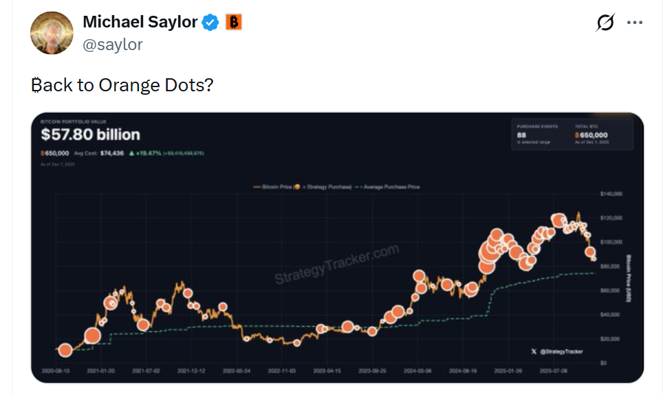 Trong khi đó, thánh 'coin' Saylor tiếp tục phát tín hiệu DCA Bitcoin khi đăng tải biểu đồ mới nhất trên X. Hiện, Strategy đang nắm giữ 650.000 BTC. Với giá vốn 48,38 tỷ USD, cá voi này đang sở hữu 3,1% nguồn cung "vàng số".