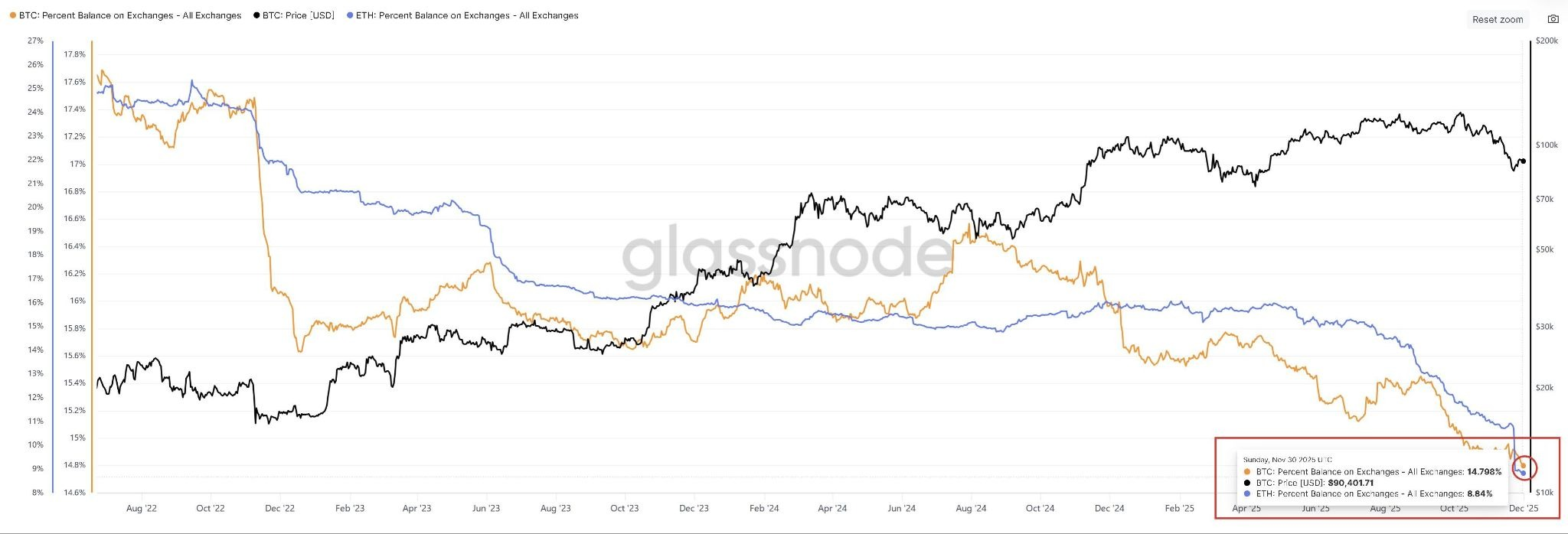 Dữ liệu on-chain tiếp tục phản ánh rõ nét diễn biến nguồn cung của Ethereum. Theo Glassnode, hiện chỉ còn khoảng 8,7%–8,9% tổng nguồn cung ETH đang nằm trên các sàn giao dịch tập trung.