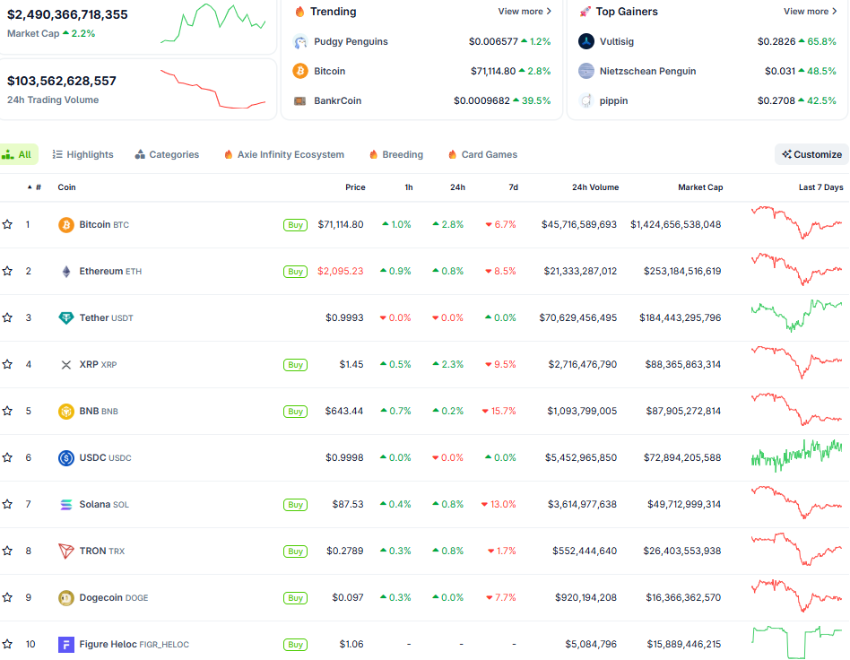 BTC giao dịch quanh ngưỡng 70.000 USD, kéo vốn hóa toàn ngành lên mốc 2,5 nghìn tỷ USD. Thị trường đã mất khoảng 2 nghìn tỷ USD từ đỉnh hồi tháng 10/2025. Biến động mạnh trong tuần qua khiến khối lượng giao dịch 24h chỉ đạt 103 tỷ USD.
