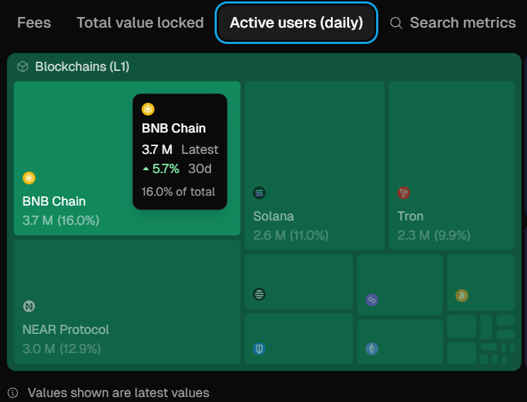 BNB Chain vượt mặt Solana mảng layer -1, với 3,7 triệu người dùng hoạt động hàng ngày (Nguồn: Tokenterminal)