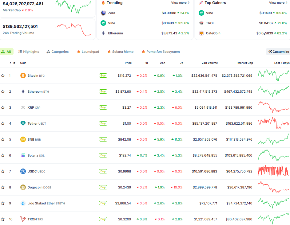 Làn sóng altcoin cũng bùng nổ, với BNB và ETH dẫn đầu. Chỉ số tâm lý thị trường vọt lên 75 điểm - lấn sâu vào vùng tham lam. Cho đến này hôm nay, vốn hóa thị trường ổn định quanh mốc 4.000 tỷ USD, với khối lượng giao dịch 24h đạt 139 tỷ USD.