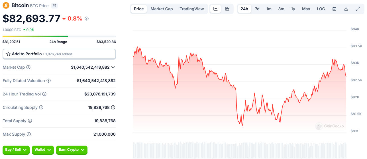 Giá Bitcoin duy trì trên mức 82.000 USD trong ngày hôm nay (Nguồn: CoinGecko)