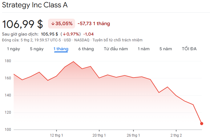 Dù chịu khoản lỗ khổng lồ, Strategy cho biết doanh thu quý 4 tăng 1,9% so với cùng kỳ, đạt 123 triệu USD, một phần nhờ mảng phần mềm phân tích dữ liệu (business intelligence). Tuy nhiên, đợt bán tháo Bitcoin gần đây đã kéo cổ phiếu công ty giảm 17% trong phiên ngày 5/2, đóng cửa ở 107 USD.