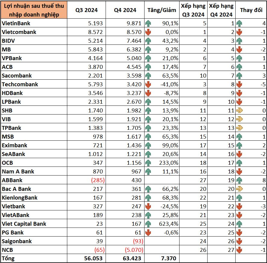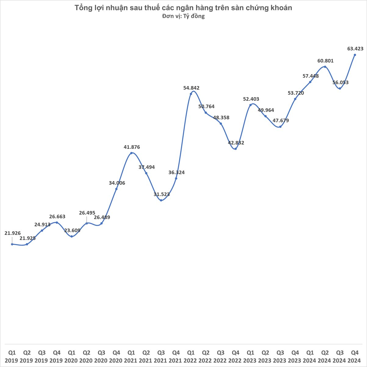 27 ngân hàng trên sàn chứng khoán đều đã công bố báo cáo tài chính quý 4/2024. Theo số liệu thống kê, tổng lợi nhuận sau thuế kỳ này của các nhà băng đạt 63.423 tỷ đồng, tăng trở lại và lập đỉnh cao mới sau khi bất ngờ giảm trong quý 3/2024.