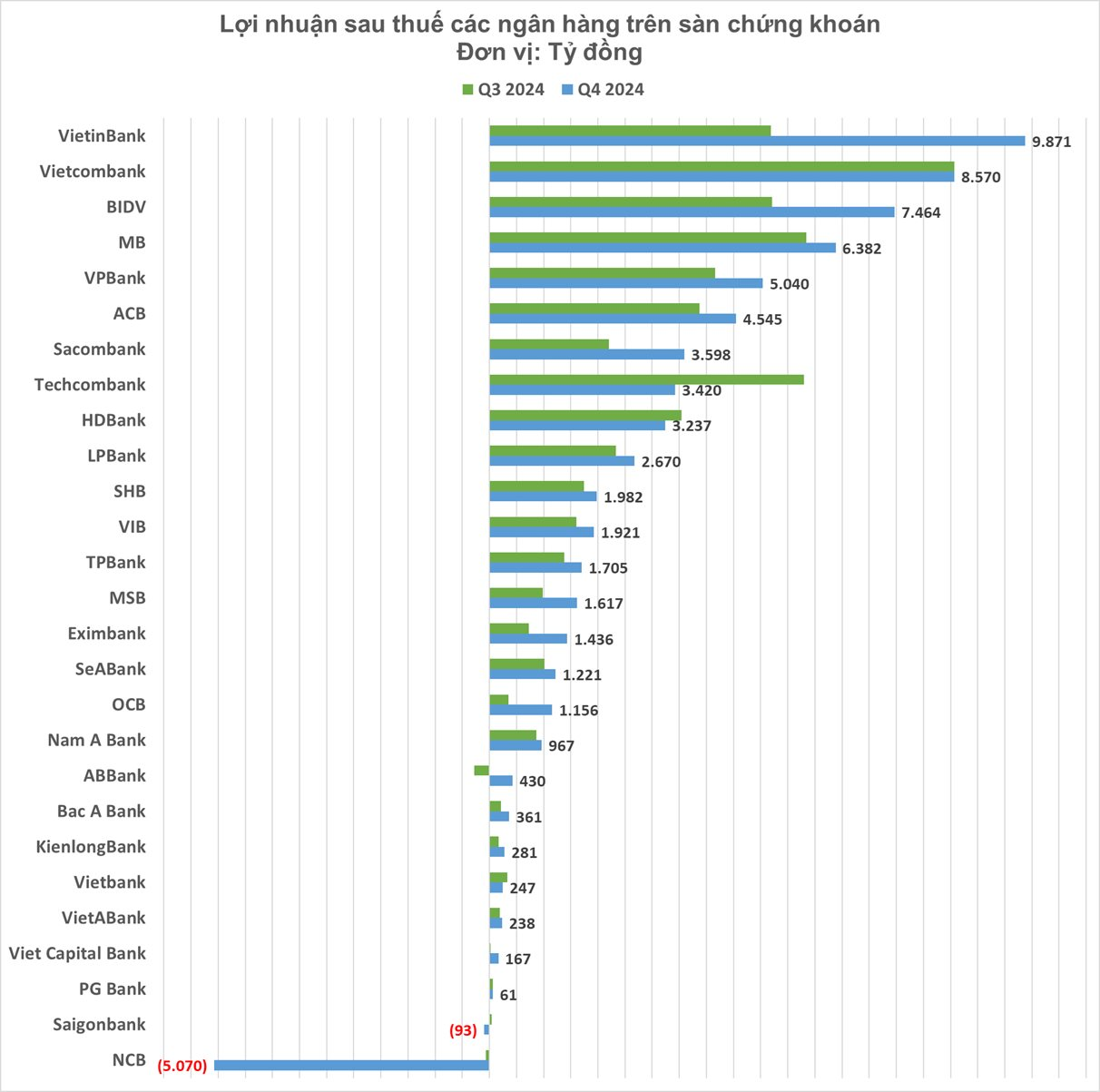 Cùng với VietinBank, BIDV và MB, còn có 5 ngân hàng khác ghi nhận lợi nhuận kỷ lục trong quý 4/2024 gồm ACB, Viet Capital Bank, Eximbank, LPBank và Sacombank.